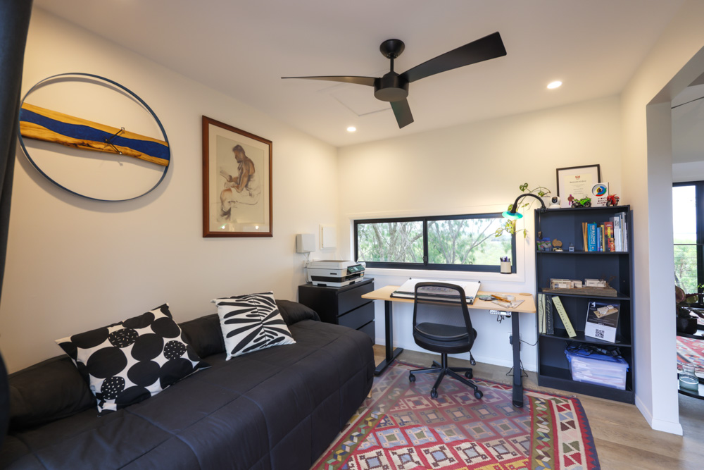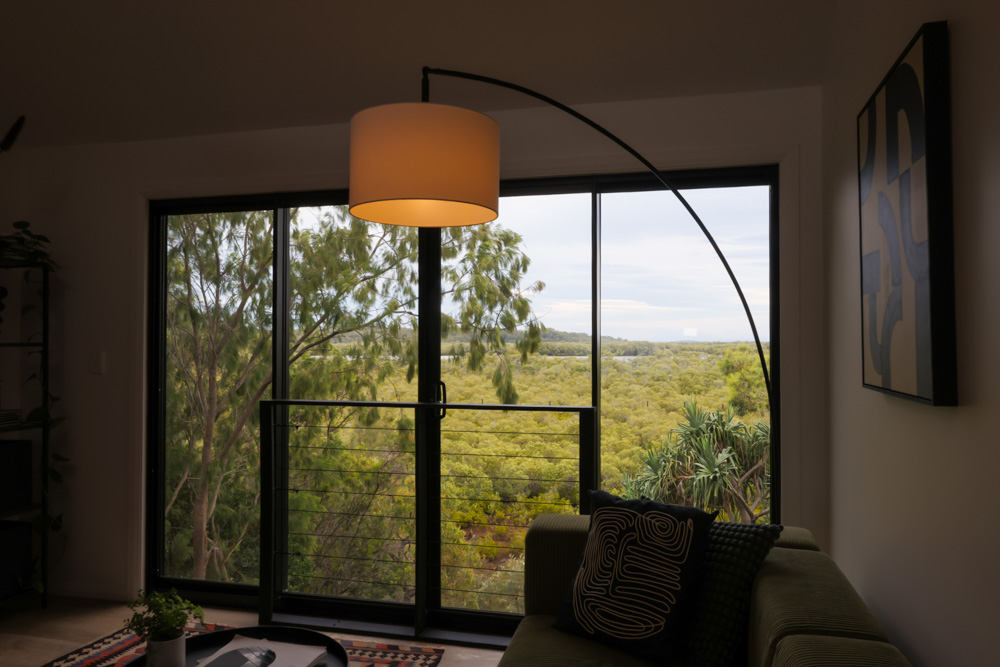Robin’s home sits comfortably within its environment, feeling connected to the landscape rather than imposed upon it. At just over 60 square metres, it is compact without ever feeling small. The open plan layout allows the space to flow easily, while generous windows bring in light, air, and constant reminders of the natural world outside. Views stretch across the mangrove forest and out over the water toward the Gold Coast, creating a sense of openness that belies the home’s footprint.