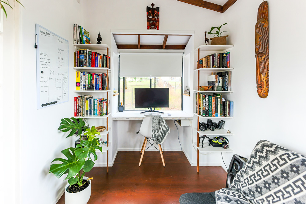 Priority in the tiny home has been given to a lovely office space, which is especially important for the couple who are in the process of starting a sustainable online business, crafting and retailing their own sustainable clothing brand, Jungle Alley. Building and living in the tiny house has given the couple a perfect platform to launch their business, as they are able to save money and reinvest to grow their new venture.