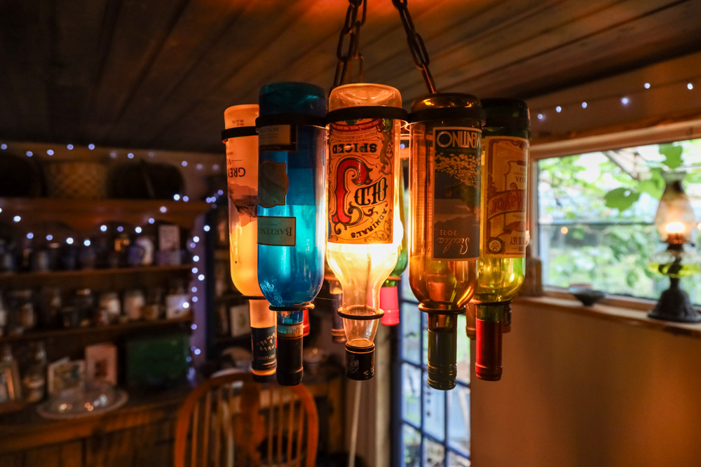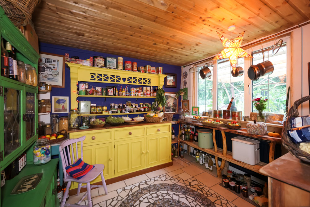 Inside the home, one of the most surprising features is a large pantry room that has been dedicated entirely to food storage. Shelves line the walls from floor to ceiling, filled with jars of preserves, ferments, dried goods and homemade brews. It may be one of the largest pantries we have ever seen in a tiny home. This room reflects a lifestyle built around preparation and resilience. It holds the harvest of the garden outside and captures the rhythm of the seasons in every jar.