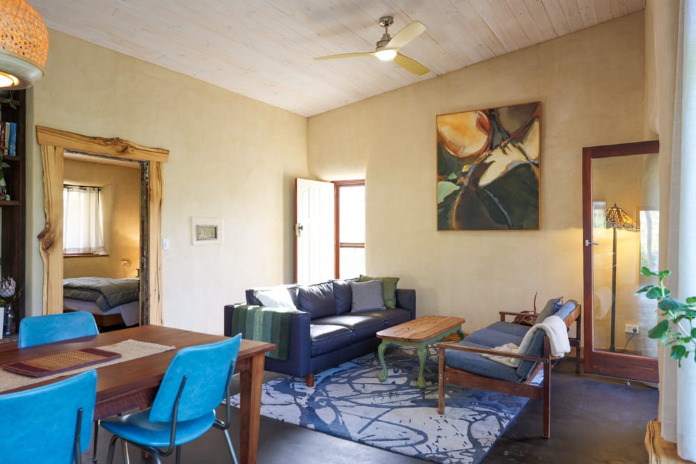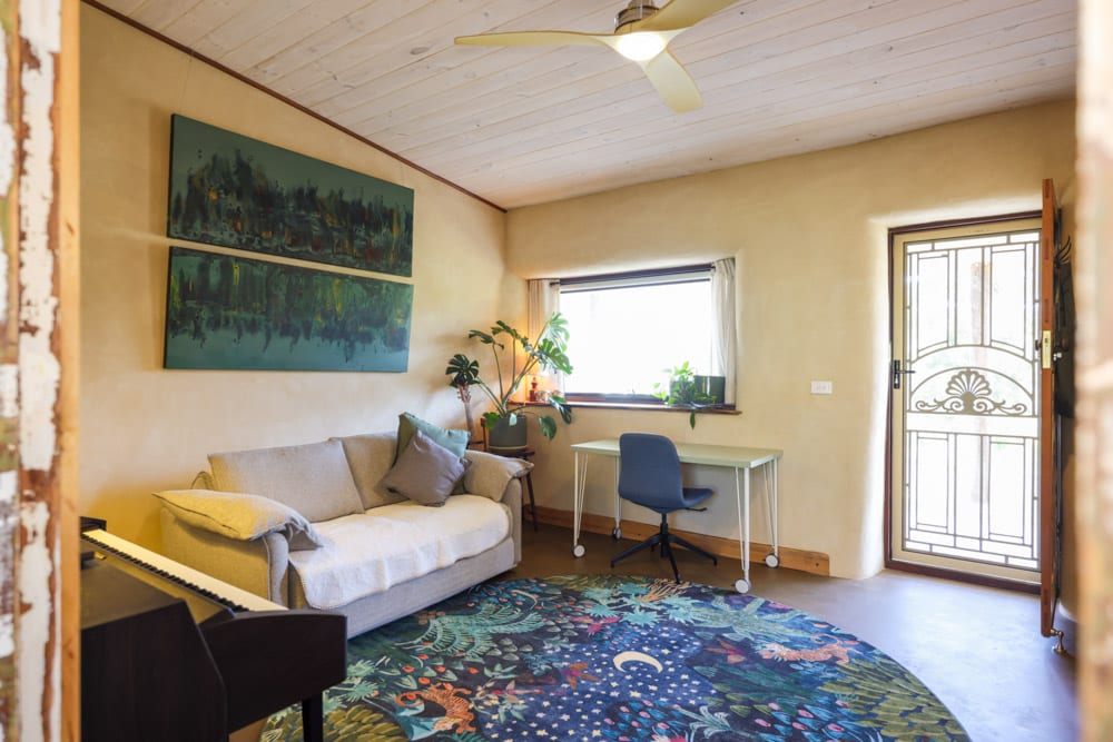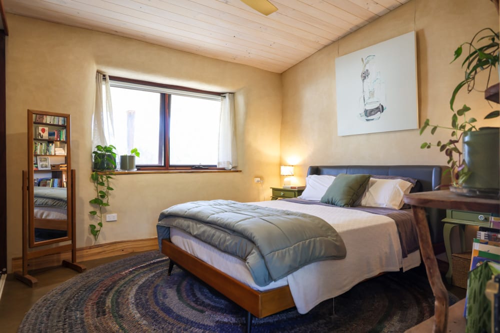 What Brenna and Charlie have created here is a natural home that truly works with its environment. The design is passive solar, with thoughtful shading and protected outdoor spaces for a wet climate, and the house stays beautifully comfortable without the kind of heating costs most of us are used to. They’ve combined straw bale insulation, cob thermal mass, and even a lesser-known technique called light earth to fine tune the home’s performance, while an attached greenhouse helps regulate temperature through the seasons. It’s practical, calm, and deeply nourishing to step inside.