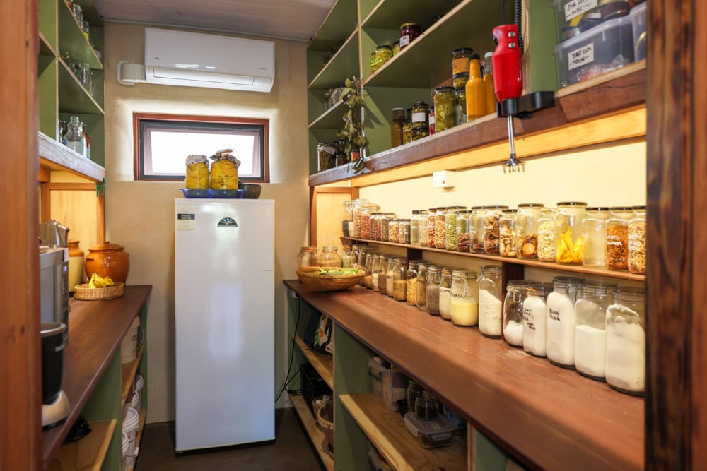 A huge part of the magic is how much of this build was salvaged and recycled. From industrial double glazing that shaped the front of the home, to reclaimed timber, demolition finds, and even old shower screens repurposed into greenhouse glass, this is a build driven by creativity and determination as much as it is by good design. The end result feels both beautiful and grounded, and it’s full of clever details, like an outdoor sink for coming straight in from the garden, a homestead kitchen built for cooking, preserving and hosting, and a pantry that happens to be the same size as the tiny house truck they once lived in.