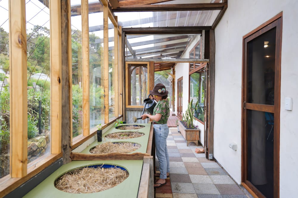 A huge part of the magic is how much of this build was salvaged and recycled. From industrial double glazing that shaped the front of the home, to reclaimed timber, demolition finds, and even old shower screens repurposed into greenhouse glass, this is a build driven by creativity and determination as much as it is by good design. The end result feels both beautiful and grounded, and it’s full of clever details, like an outdoor sink for coming straight in from the garden, a homestead kitchen built for cooking, preserving and hosting, and a pantry that happens to be the same size as the tiny house truck they once lived in.