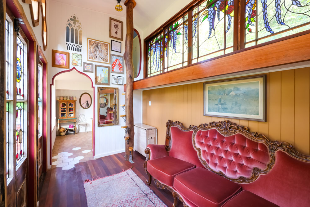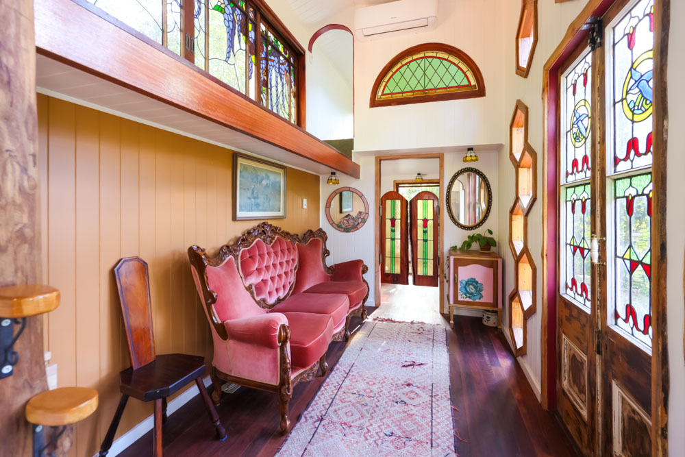From the outside in, the home is a reflection of the natural world. Its architecture draws on the intricate geometry of the hive, with soft curves, honeycomb motifs, and abundant windows that let light dance through the space. The house feels alive with colour, especially thanks to Emily’s collection of vintage stained glass windows that scatter vibrant patterns across the interior as the sun moves through the day.