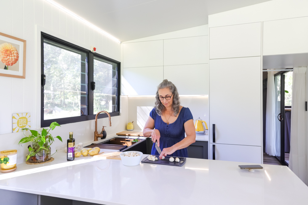 The story behind this build is as heartwarming as the home is beautiful. After Tiff’s father passed away, she promised her mother that they would stay close and support each other. Building this tiny home on the family property means they can all live nearby — with Tiff, Tony, and Tiff’s mum each having their own space, but still able to share family life and support one another.