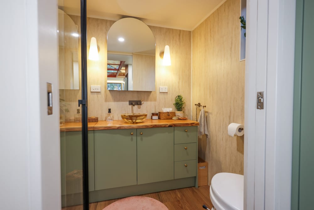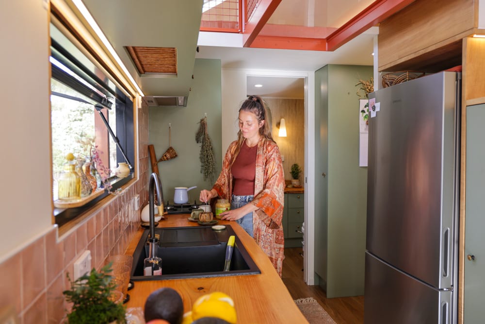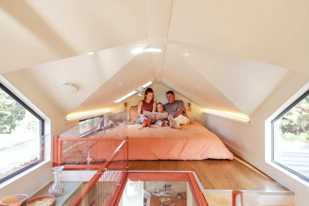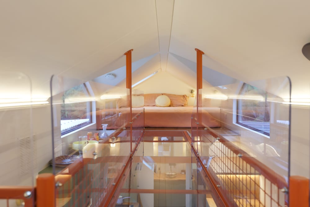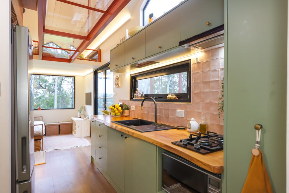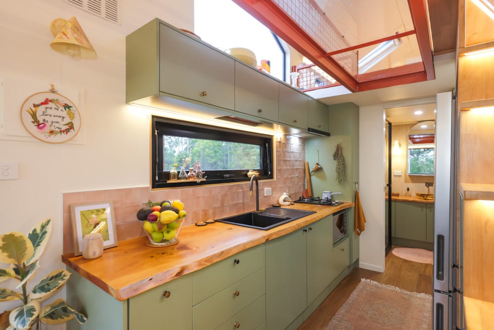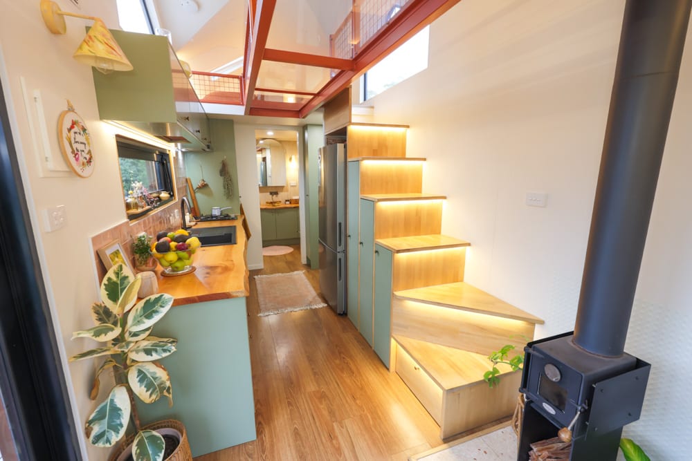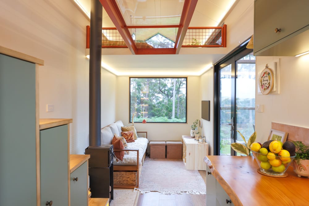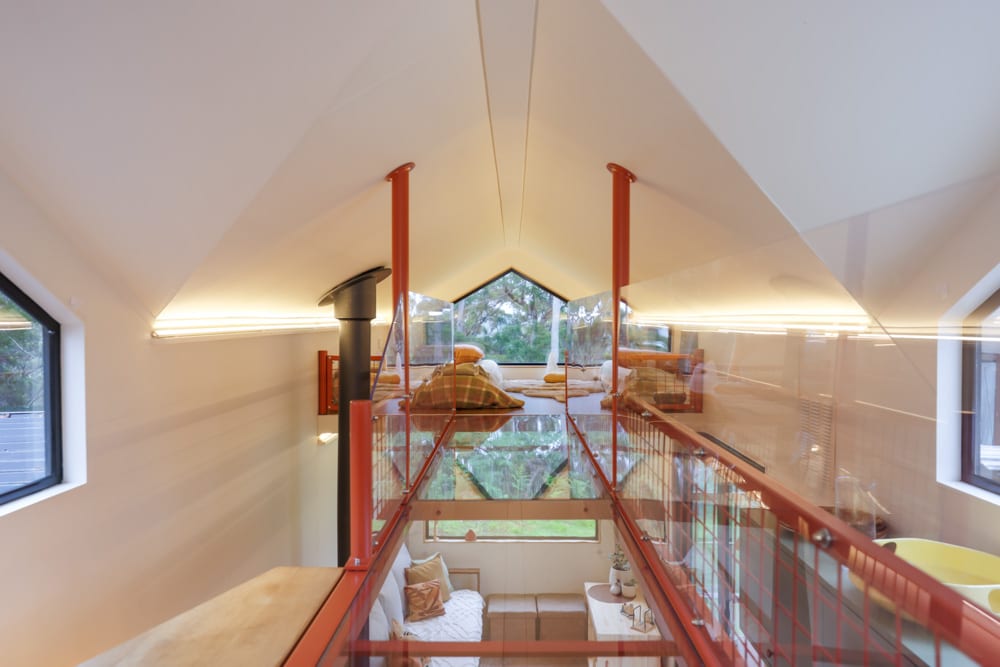 This tiny house is a reflection of deep thought, creativity, and intention. After living in a previous tiny home, Jackie set out to design something that would truly work for their family. The result is a home filled with clever ideas, from the beautiful split-level roofline and dormer windows that flood the space with light, to the unique central walkway connecting the lofts, complete with a see-through perspex floor that adds both function and a sense of openness.