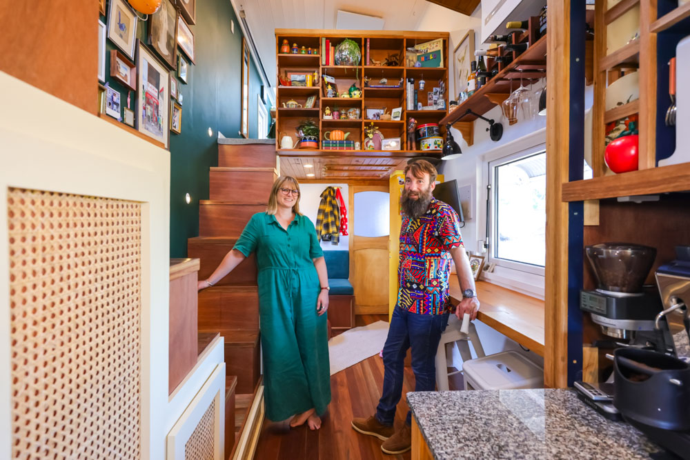 Despite its compact footprint, this tiny home packs in an impressive amount of functionality. There’s a generous kitchen, a cosy lounge, a sleeping loft, a dedicated craft room, and clever storage solutions everywhere you look. Every space is filled with meaningful objects—artworks, souvenirs from travels, books, and mementos that tell the story of two rich and creative lives.