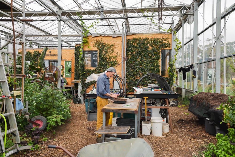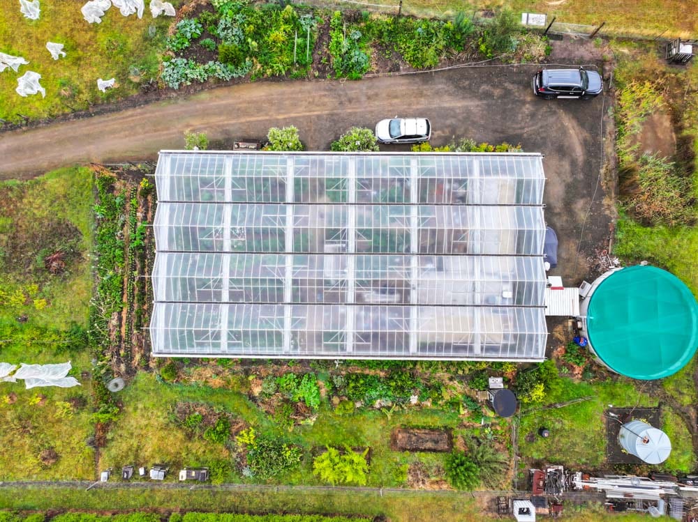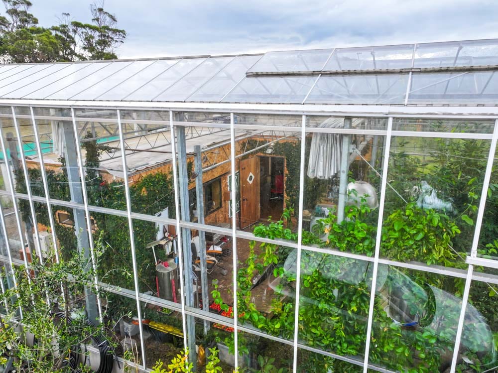 At the centre of a 300 square metre commercial greenhouse sits his tiny house. Around it, a productive garden supplies vegetables, herbs and seasonal crops. This isn’t just a place to live. It’s also where he grows food and earns an income, supplying produce to a local restaurant.
