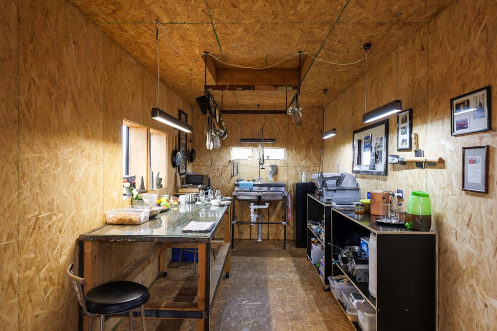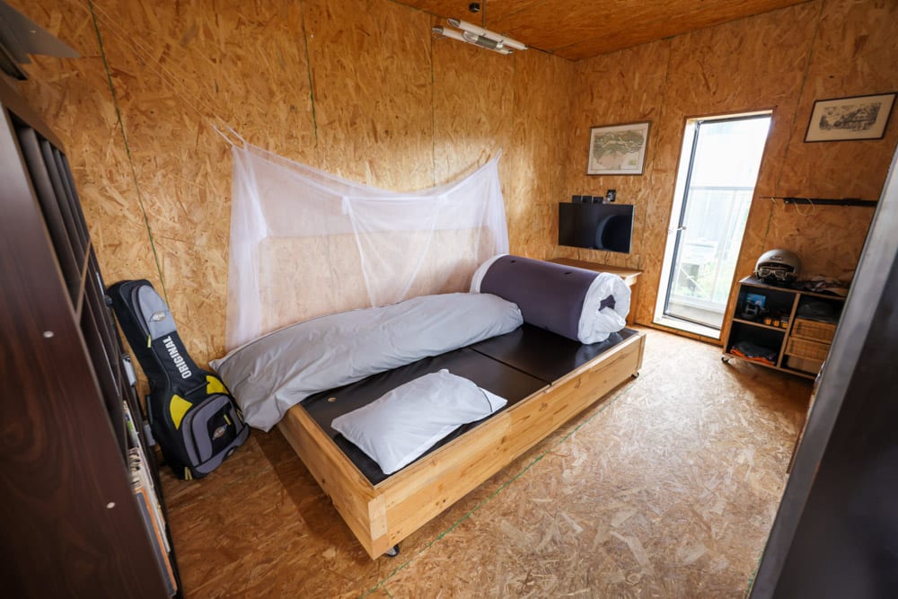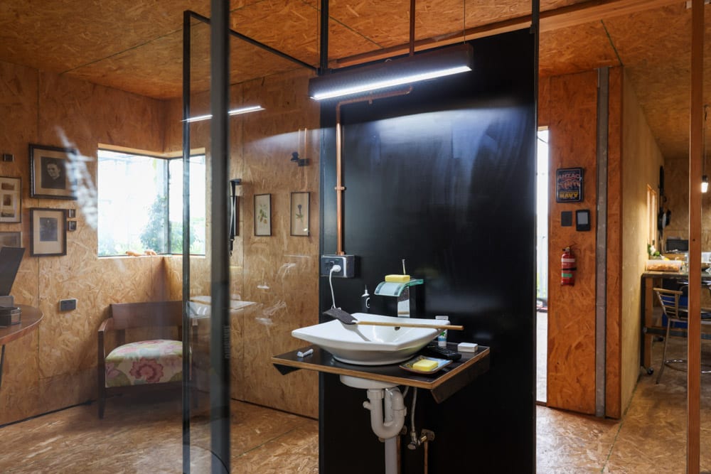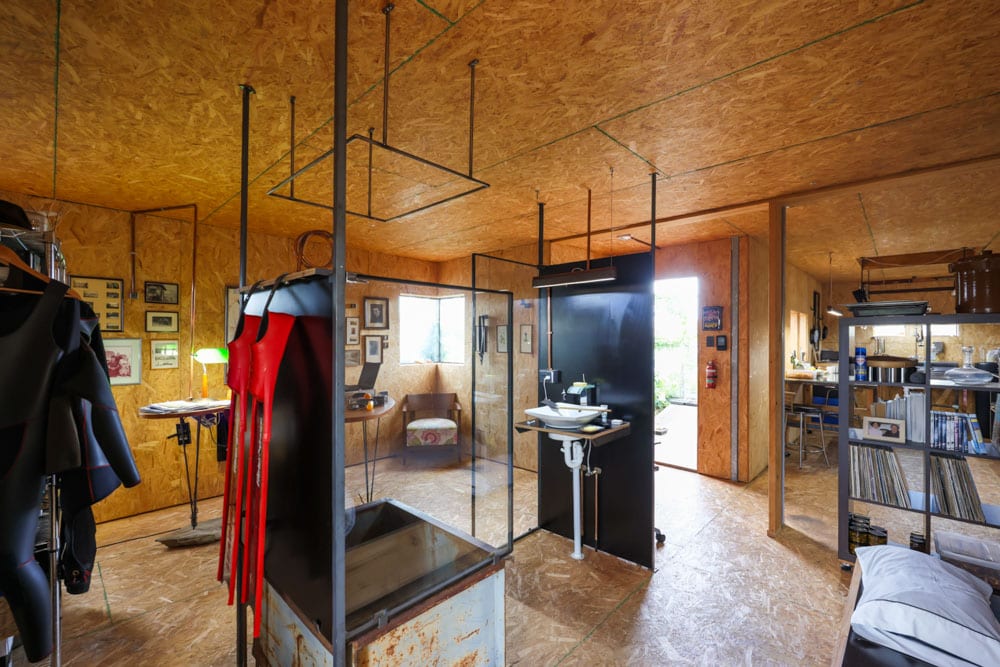 There are plenty of unconventional details throughout. The shower is simple and open. The oven can be rolled outside to keep heat out of the house in summer. The toilet is located separately. None of it is complicated, but it all makes sense within the context of how he lives.