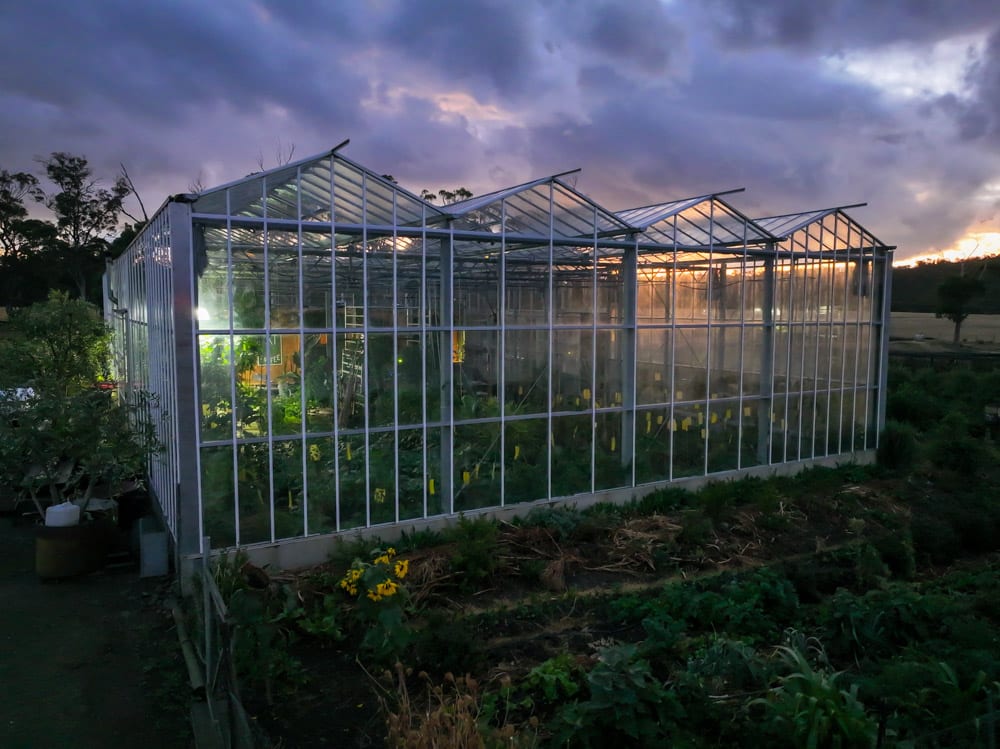 The greenhouse itself was imported from the Netherlands, packed into a shipping container and assembled on site. At over 300 square metres, it provides more than enough space for both the house and the surrounding garden.