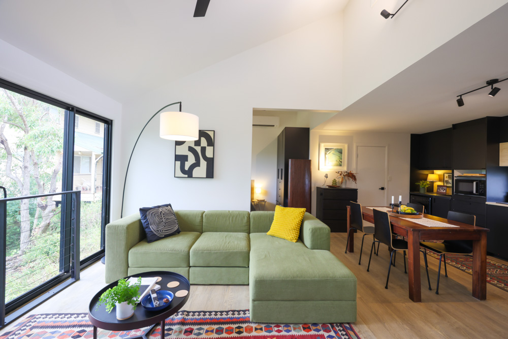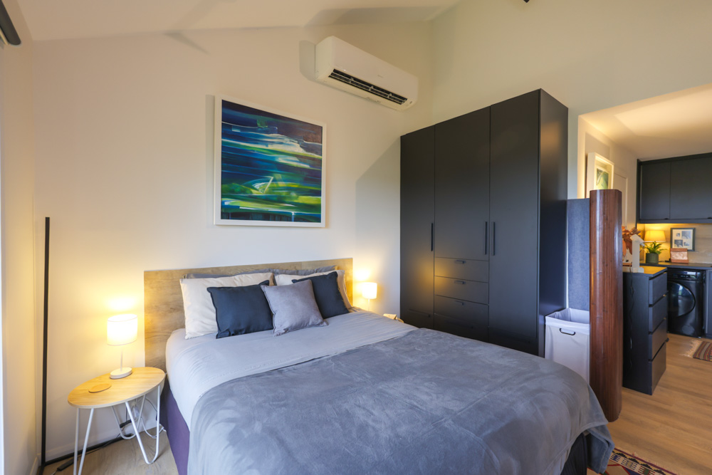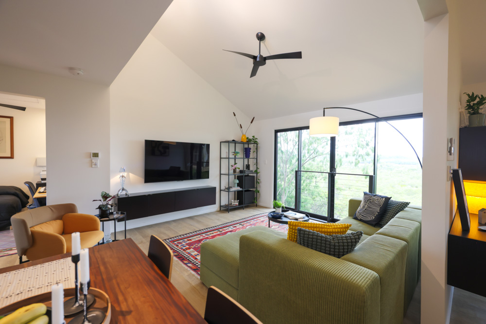 Robin’s home sits comfortably within its environment, feeling connected to the landscape rather than imposed upon it. At just over 60 square metres, it is compact without ever feeling small. The open plan layout allows the space to flow easily, while generous windows bring in light, air, and constant reminders of the natural world outside. Views stretch across the mangrove forest and out over the water toward the Gold Coast, creating a sense of openness that belies the home’s footprint.