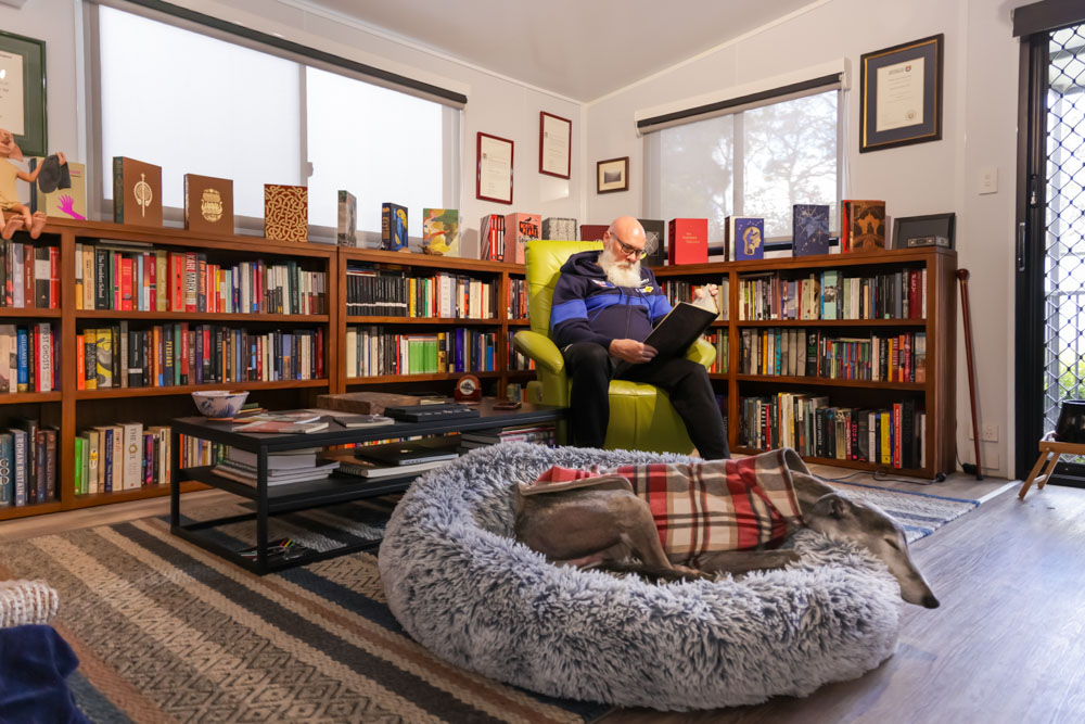 Phil describes himself as a bit of a recluse, but it is clear that this is a life he has chosen with intention. From his home, he travels to countless worlds through the pages of his books. He journeys into the past, glimpses the future and explores realms of pure fantasy. Sitting in his deep green Chicago armchair, Billy Blue curled at his feet, Phil can wander anywhere he pleases without ever leaving the room.