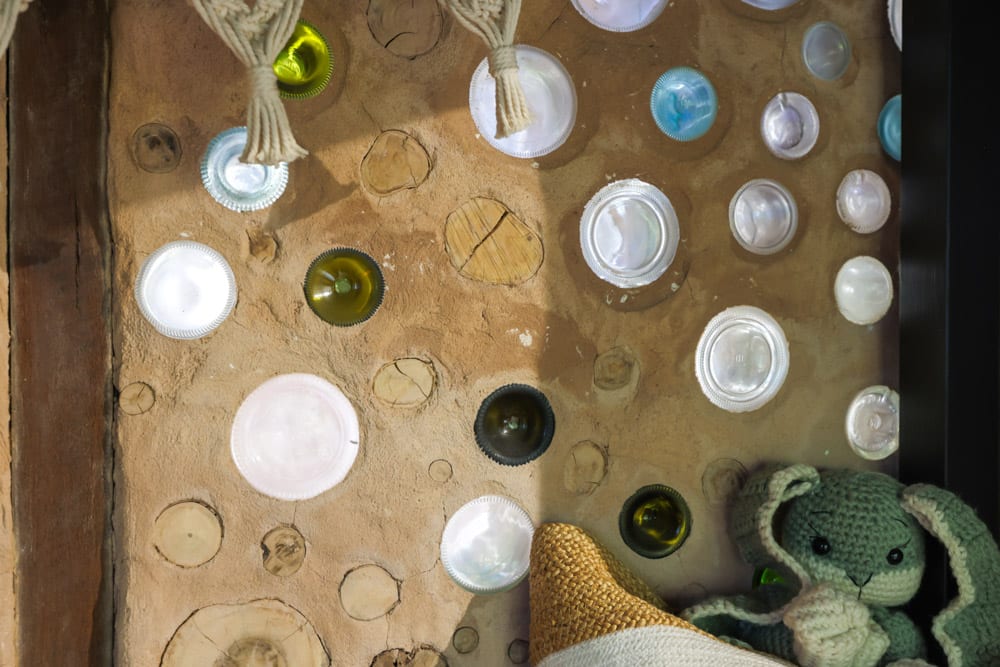 Inside, the tiny house feels warm, grounded and surprisingly spacious. A striking cordwood feature wall made from reclaimed timber adds natural texture and colour, while a pitched roof and loft bedroom create a sense of openness. Large French doors open directly into the garden, blurring the line between indoors and out.