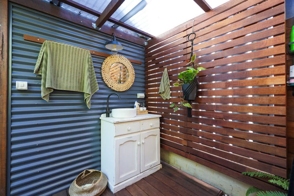 The compact galley kitchen was built on a tight budget using flat-pack cabinetry and simple appliances, yet it delivers everything needed for daily life. An induction cooktop, convection microwave, clever storage and ample bench space prove that a small footprint can still be highly functional. Outside, an outdoor shower and composting toilet deepen the connection to nature and support a low-impact lifestyle.