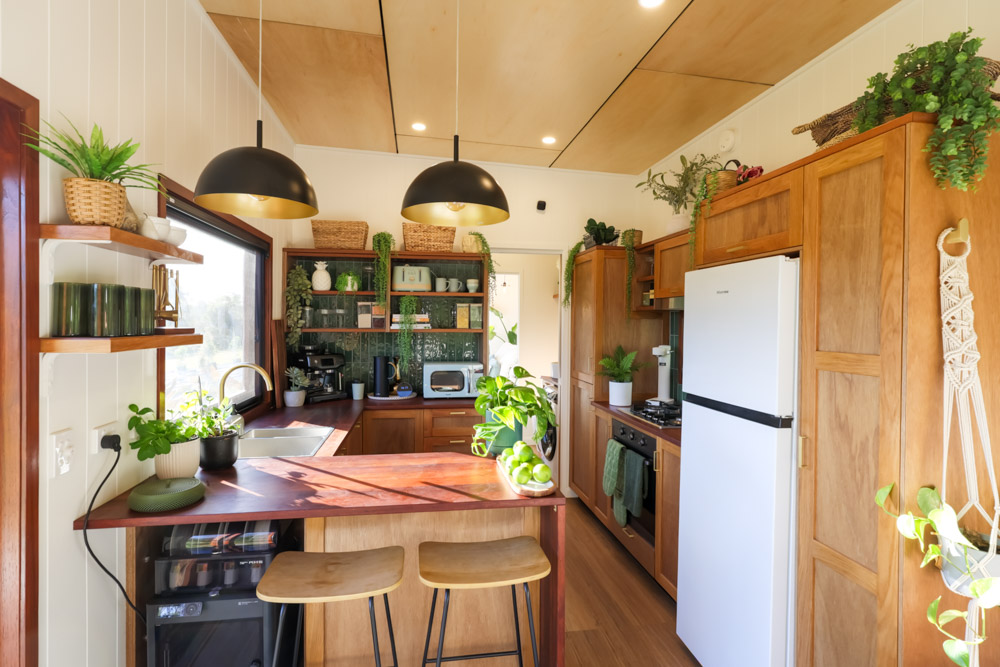 The house itself is a single-level design, and that alone makes it unique in the tiny house world. Many small homes rely on lofts to maximise floor area, but David’s home proves that clever planning can keep everything on one level without losing functionality or space. The layout flows effortlessly, with an open-plan living area, a compact but well-equipped kitchen, and a bedroom that feels surprisingly generous for its footprint.