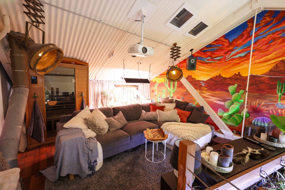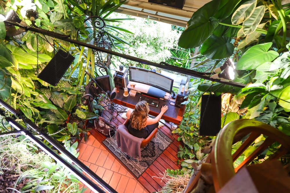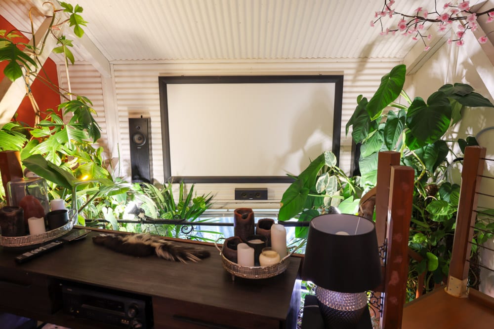 Upstairs, towering philodendrons climb custom moss poles that simulate tree trunks, allowing aerial roots to attach and grow just as they would in a rainforest. The top level embraces warmth and light with a cactus-filled loft, a relaxed cinema area and even an infrared sauna. Every level has been designed to work with natural airflow, light exposure and microclimates within the apartment.
