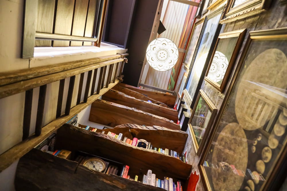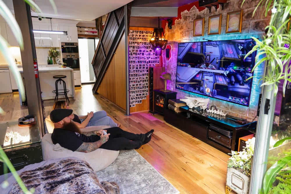 Natural materials like timber and stone sit comfortably alongside the greenery, reinforcing the home’s strong biophilic identity. In the bathroom, plants cascade around the shower, turning everyday routines into something that feels almost like bathing in a forest. Feature walls incorporate fossils and textured finishes, adding layers of detail and personality. Aquariums introduce another living dimension to the space, while the couple’s eclectic design style gives the apartment a bold, maximalist character.