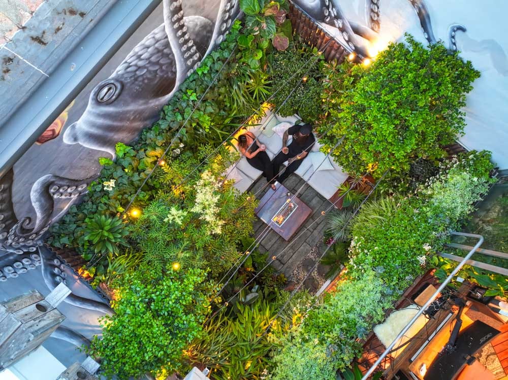 The apartment unfolds across three levels, with a central courtyard forming the green heart of the space. Instead of treating it as a simple outdoor area, Nicole and Drew transformed it into a thriving ecosystem. Plants spill upward, blurring the line between indoors and outdoors and creating dramatic vertical layers that give the home its three-story scale.