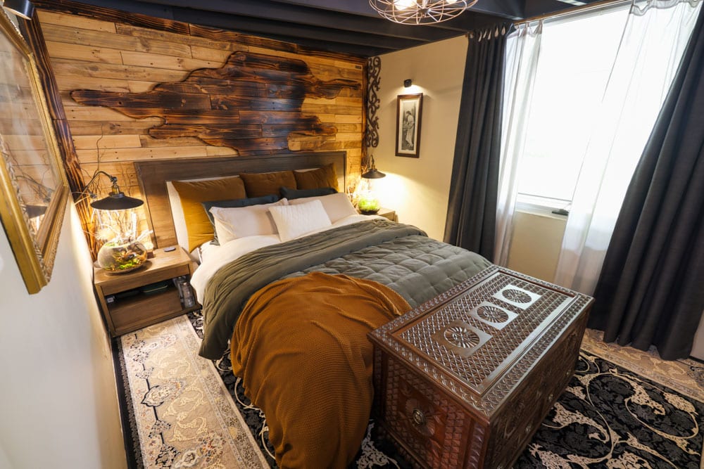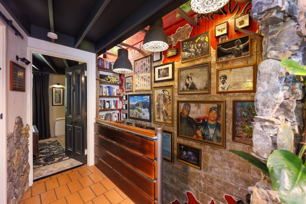 Natural materials like timber and stone sit comfortably alongside the greenery, reinforcing the home’s strong biophilic identity. In the bathroom, plants cascade around the shower, turning everyday routines into something that feels almost like bathing in a forest. Feature walls incorporate fossils and textured finishes, adding layers of detail and personality. Aquariums introduce another living dimension to the space, while the couple’s eclectic design style gives the apartment a bold, maximalist character.