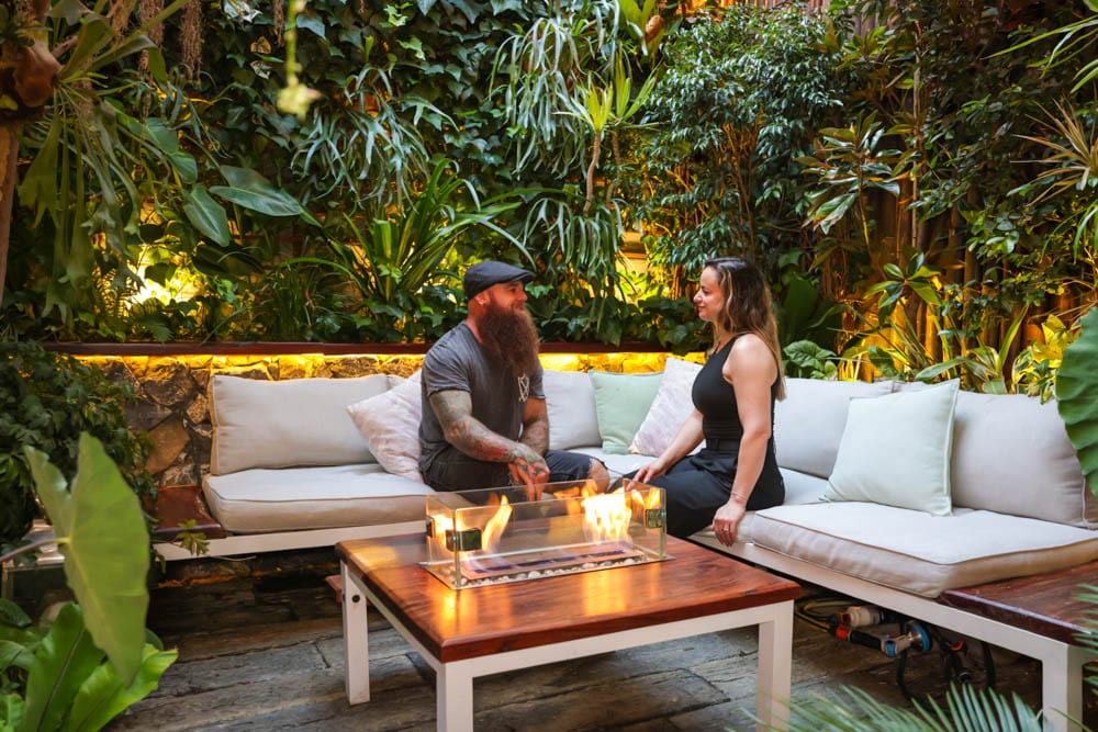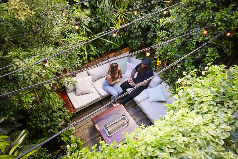 The apartment unfolds across three levels, with a central courtyard forming the green heart of the space. Instead of treating it as a simple outdoor area, Nicole and Drew transformed it into a thriving ecosystem. Plants spill upward, blurring the line between indoors and outdoors and creating dramatic vertical layers that give the home its three-story scale.