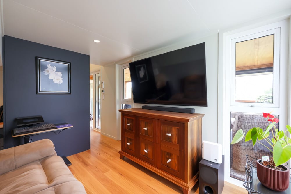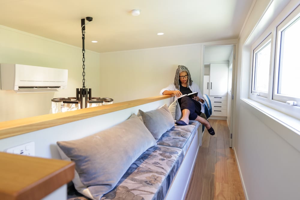 One of the most unique aspects of this home is the bedroom, set in its own dedicated pod. Connected seamlessly to the main house, it offers a sense of privacy and space that is rarely seen in tiny homes. Soft, warm, and incredibly comfortable, it feels like a true retreat. Even here, the future has been considered, with provisions already in place for a potential second bathroom down the track.