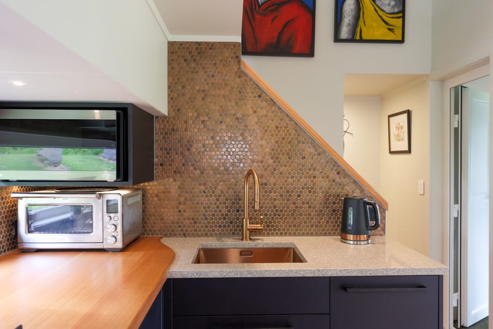 Inside, the kitchen immediately sets the tone. Finished in a striking black and copper palette, it feels bold, refined, and unmistakably high-end. From the custom cabinetry to the copper tile backsplash, nothing has been left to chance. Even the smallest details, like the curved benchtop, have been designed with both comfort and practicality in mind.