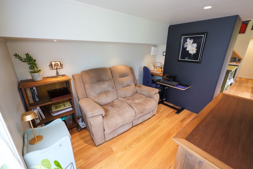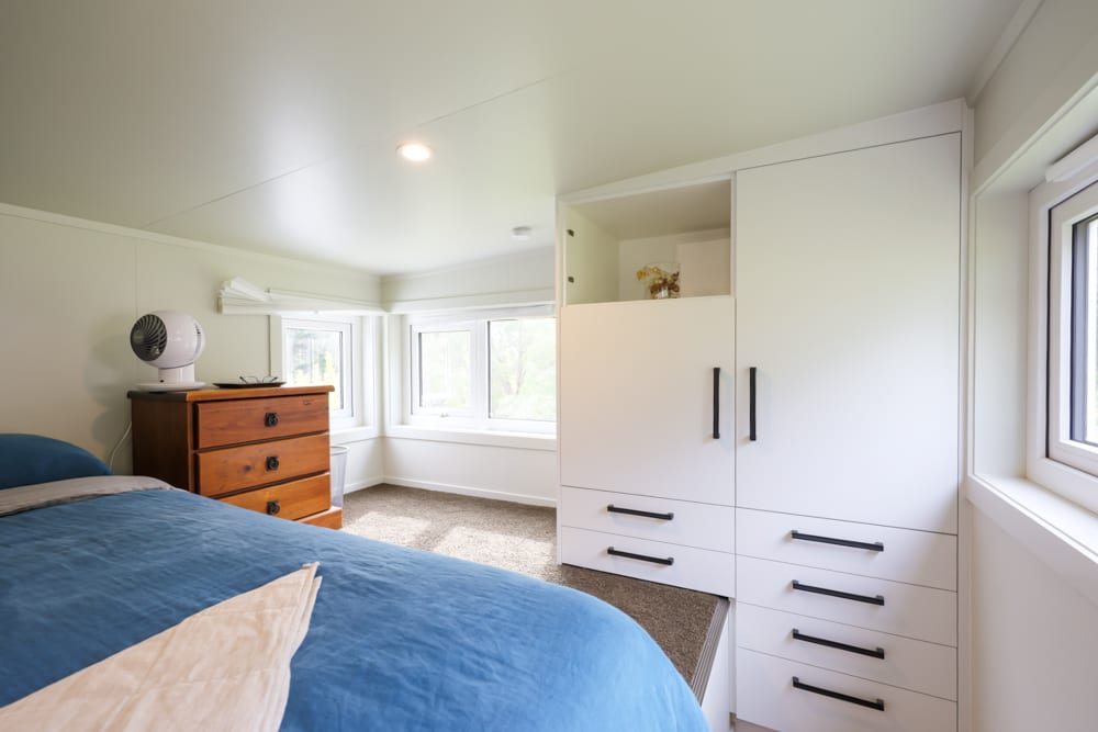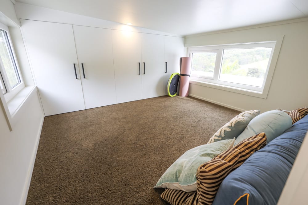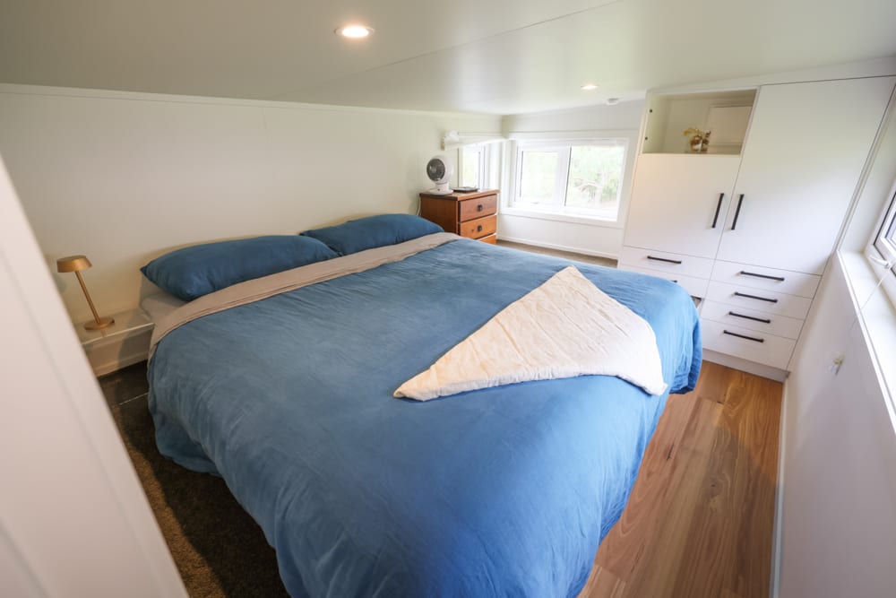 One of the most unique aspects of this home is the bedroom, set in its own dedicated pod. Connected seamlessly to the main house, it offers a sense of privacy and space that is rarely seen in tiny homes. Soft, warm, and incredibly comfortable, it feels like a true retreat. Even here, the future has been considered, with provisions already in place for a potential second bathroom down the track.