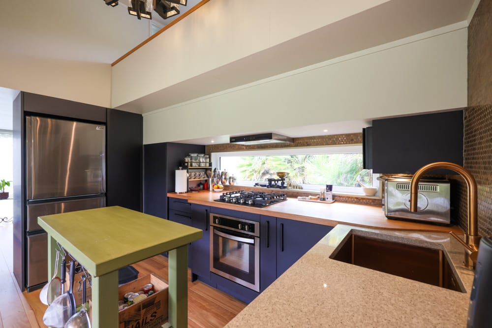Inside, the kitchen immediately sets the tone. Finished in a striking black and copper palette, it feels bold, refined, and unmistakably high-end. From the custom cabinetry to the copper tile backsplash, nothing has been left to chance. Even the smallest details, like the curved benchtop, have been designed with both comfort and practicality in mind.