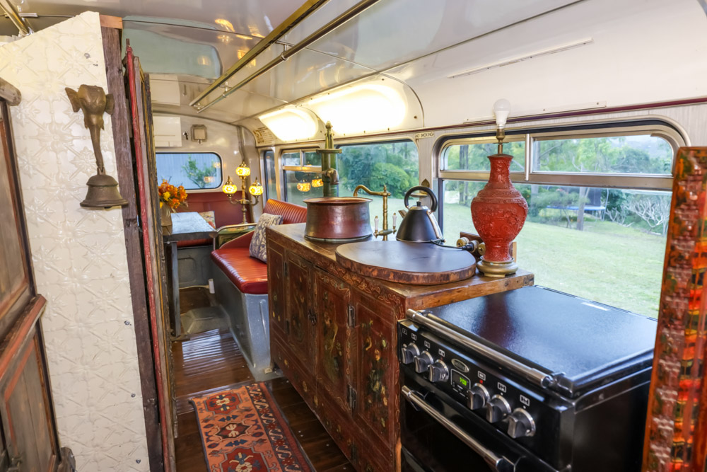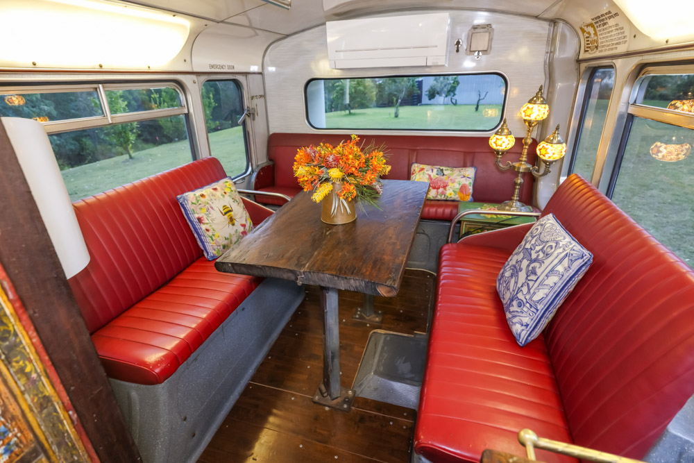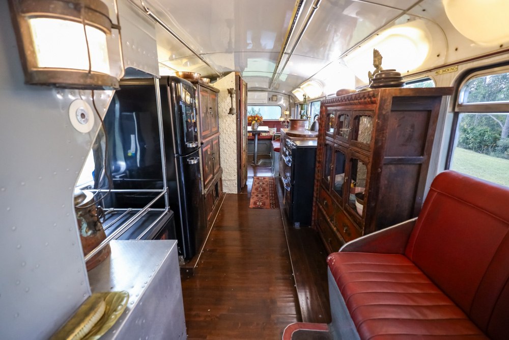 Step inside today and you find a space that feels at once familiar and surprising. The character of the bus is still very much intact, with original features carefully preserved wherever possible, but layered on top of that is a warmth and elegance that comes from a collection of antique furniture sourced from all over the world. Instead of filling the space with built-in furniture like most bus conversions, Ted and Kim took a bold and unconventional approach. They wanted to prove that a bus could be fitted out as a home using timeless pieces with stories of their own. Each chair, table, and cabinet has been bolted securely into place, creating an interior that feels more like stepping into a heritage home than a vehicle on wheels.