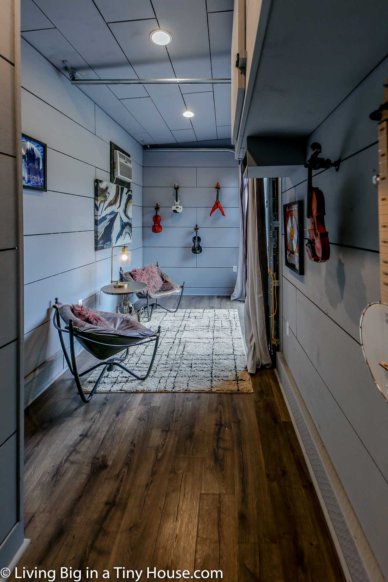 The music studio next door adds a completely different element. It’s well insulated and sound proofed and provides the perfect place for Asha to store her instruments, practice her music and create her art. Constructed on wheels, this mobile music studio can be even taken on the road and is capable of being used as a performance space.