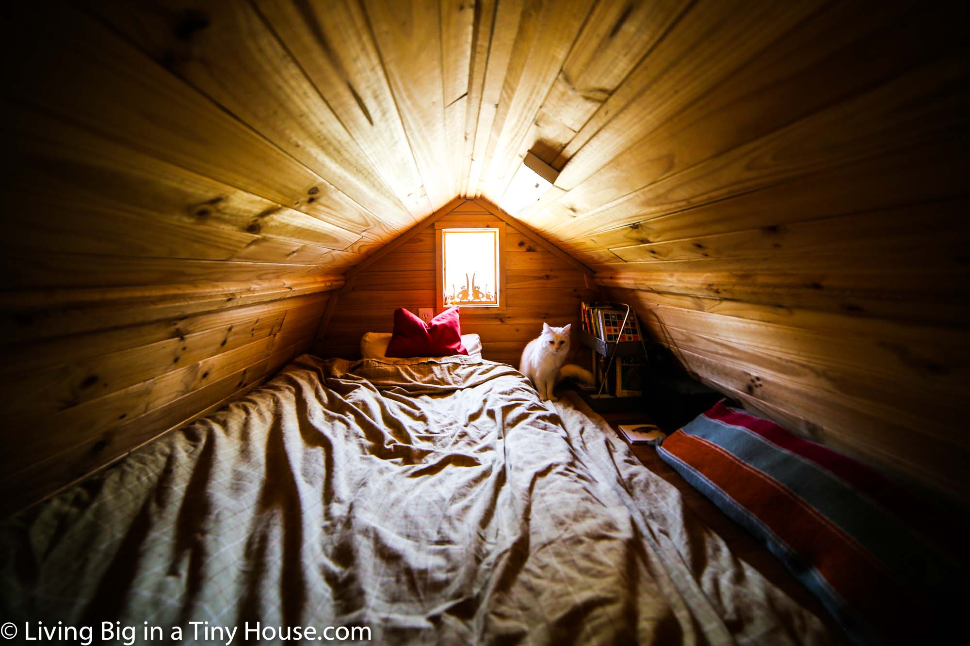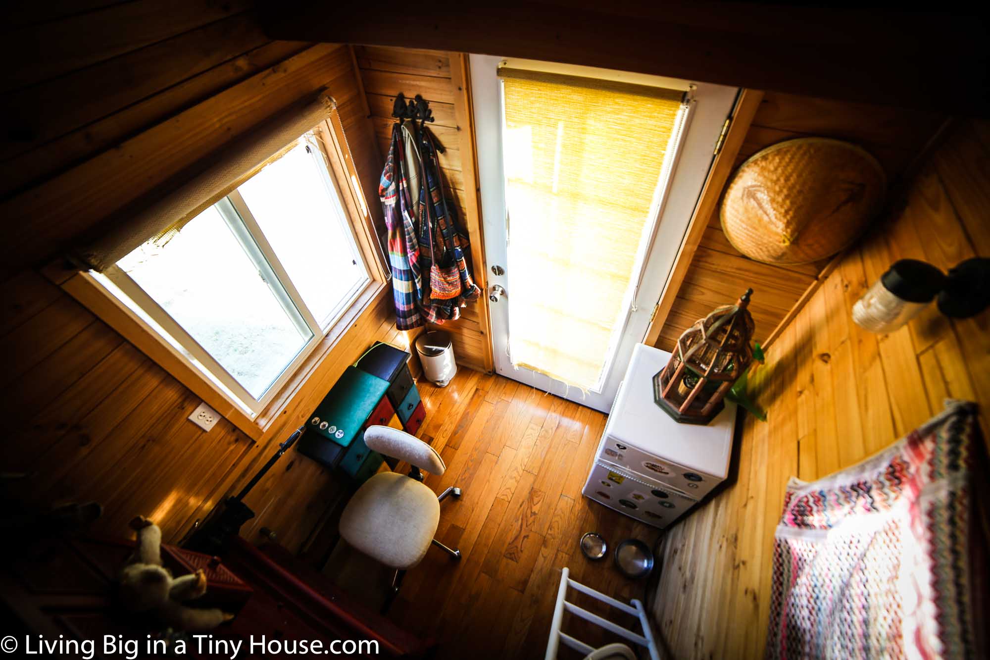 Inside, Gabriella’s tiny house on wheels is simple, yet beautiful. It is a perfect example of a home that has been uniquely transformed to meet the needs of the individual living inside. The bathroom and kitchen were removed from the tiny house to make room for a large bookcase, and many aspects of the home are set up to allow Gabriella to either immerse herself in her research, or to have some occasional retreat from the demands of the surrounding center.