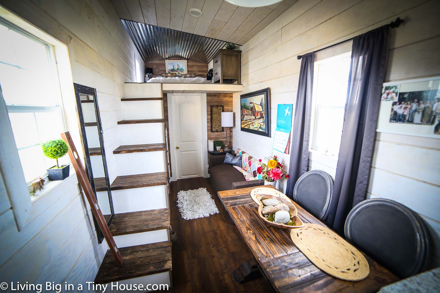 Inside, the tiny house is packed full of charm and character. The front door opens into a large living room area, with hardwood floors and a high roof. There is plenty of space for seating and entertaining small groups.